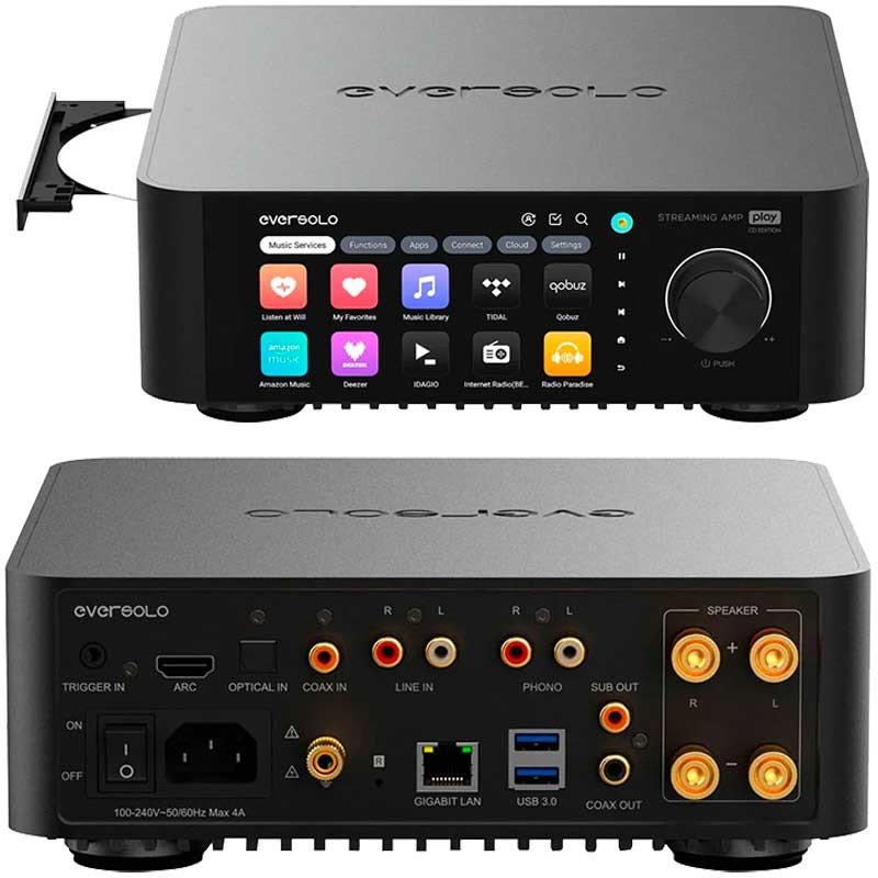 Le EverSolo Play CD Edition est une version enrichie du célèbre amplificateur connecté EverSolo Play, intégrant un lecteur CD haute précision pour combiner musique dématérialisée et lecture physique sans compromis. Équipé du DAC AKM AK4493SEQ et de l’amplification classe D délivrant 60 W sous 8 Ω (110 W sous 4 Ω), il prend en charge les flux jusqu’à DSD512 et PCM 768 kHz / 32 bits. Compatible Tidal, Qobuz, Amazon Music, HighResAudio, DLNA et Roon Ready, il permet une restitution fluide, détaillée et chaleureuse, avec un grand écran tactile de 5,5 po et une ergonomie exemplaire.